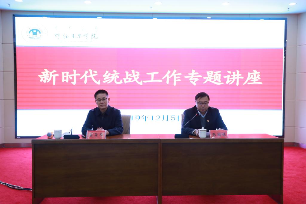 為深入理解和把握黨的十九大和習近平新時代中國特色社會主義思想對統戰工作提出的新要求,切實發揮好統一戰線優勢,凝聚各方面力量推進應用型大學建設,12月5日,黨委統戰部在崇文樓A201會議室舉辦新時代統戰工作專題講座。內蒙古社會主義學院黨組成員、副院長趙景華受邀做題為“新時代統一戰線理論創新與實踐發展”專題講座。黨委副書記張國棟、紀委書記岳勇和全校副處級以上干部、樣板黨支部書記近120人聆聽了講座。