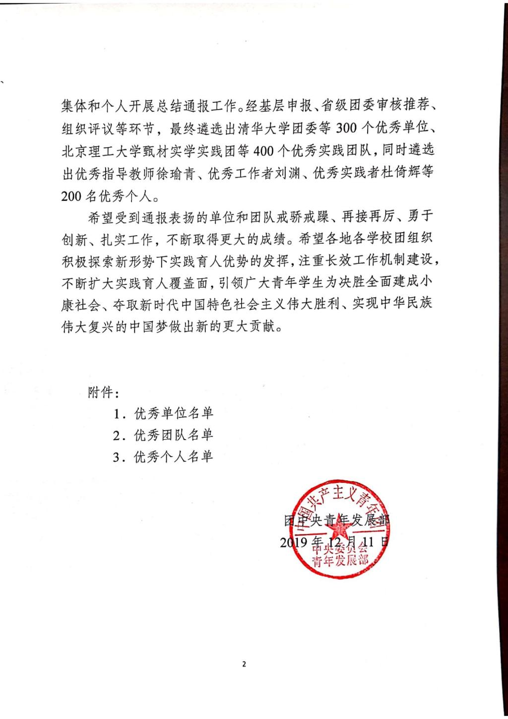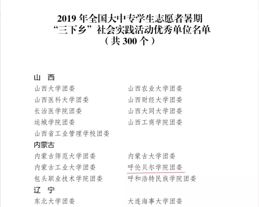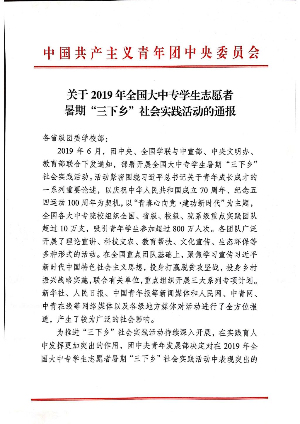 近日,團中央青年發展部下發了《關于2019年全國大中專學生志愿者暑期“三下鄉”社會實踐活動的通報》,我校榮獲2019年全國大中專學生志愿者暑期“三下鄉”社會實踐活動優秀單位榮譽稱號。我校已連續兩年獲此殊榮。