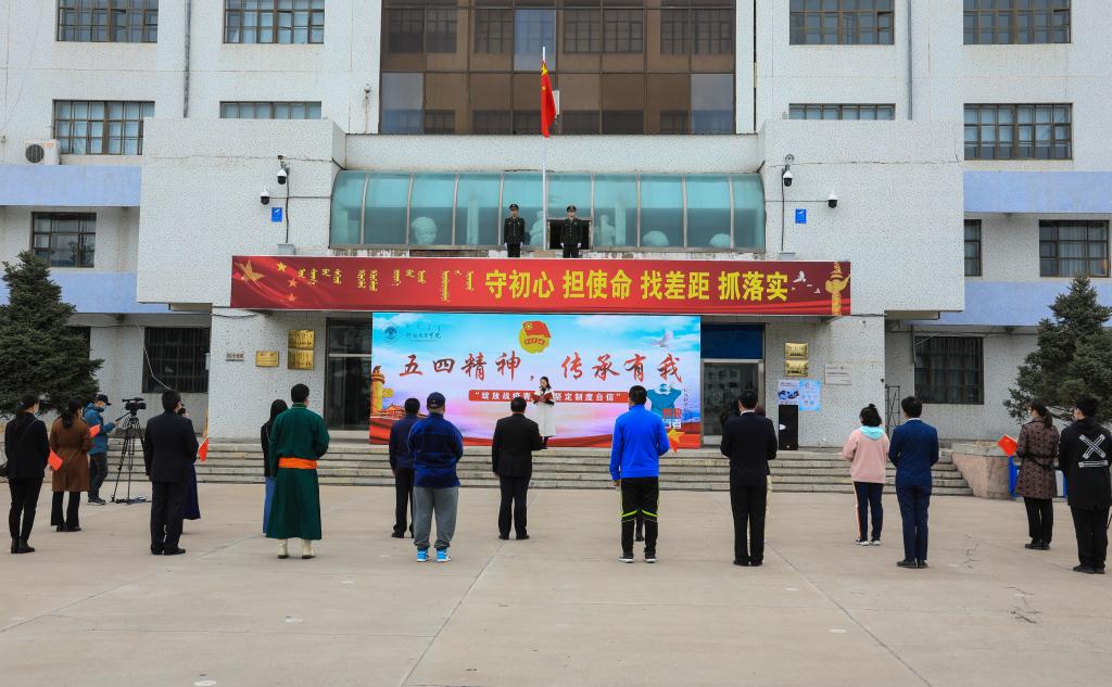 五四青年節來臨之際,5月4日上午八點,在綜合樓前,我校舉辦“五四精神 傳承有我”主題升旗儀式。校黨委副書記張國棟,團委書記郝新君、團委副書記格根塔娜及全體共青團干部參加。全校共5000余名學生在線上參加。化學化工學院團總支書記孟慶永、機電工程學院團總支書記佟晟擔任升旗手。