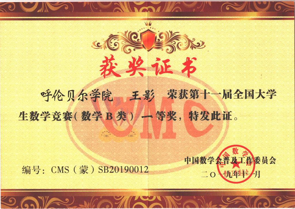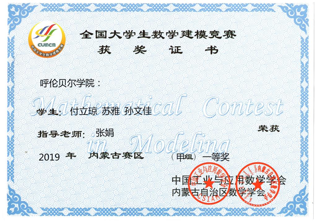 近日,2019年全國大學生數學競賽和數學建模競賽結果相繼揭曉,我校數學與統計學院學子在兩大競賽中再創佳績,在全國大學生數學競賽中有1人獲得內蒙古賽區一等獎,8人獲得內蒙古賽區二等獎、8人獲得內蒙古賽區三等獎,在全國大學生數學建模競賽中有3人獲得內蒙古賽區一等獎,3人獲得內蒙古賽區三等獎。