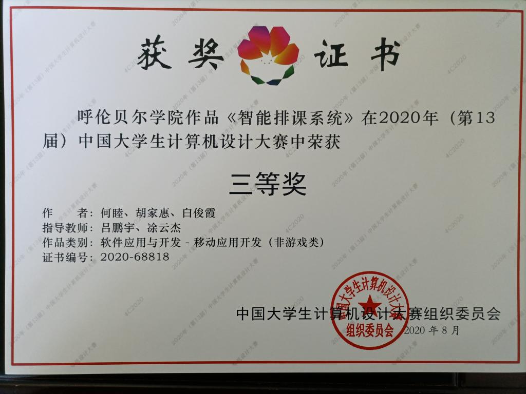 8月11日至13日在山東大學舉辦的2020年(第13屆)中國大學生計算機設計大賽總決賽上,我校計算機學院取得零的突破,奪得全國三等獎2項,優勝獎1項。