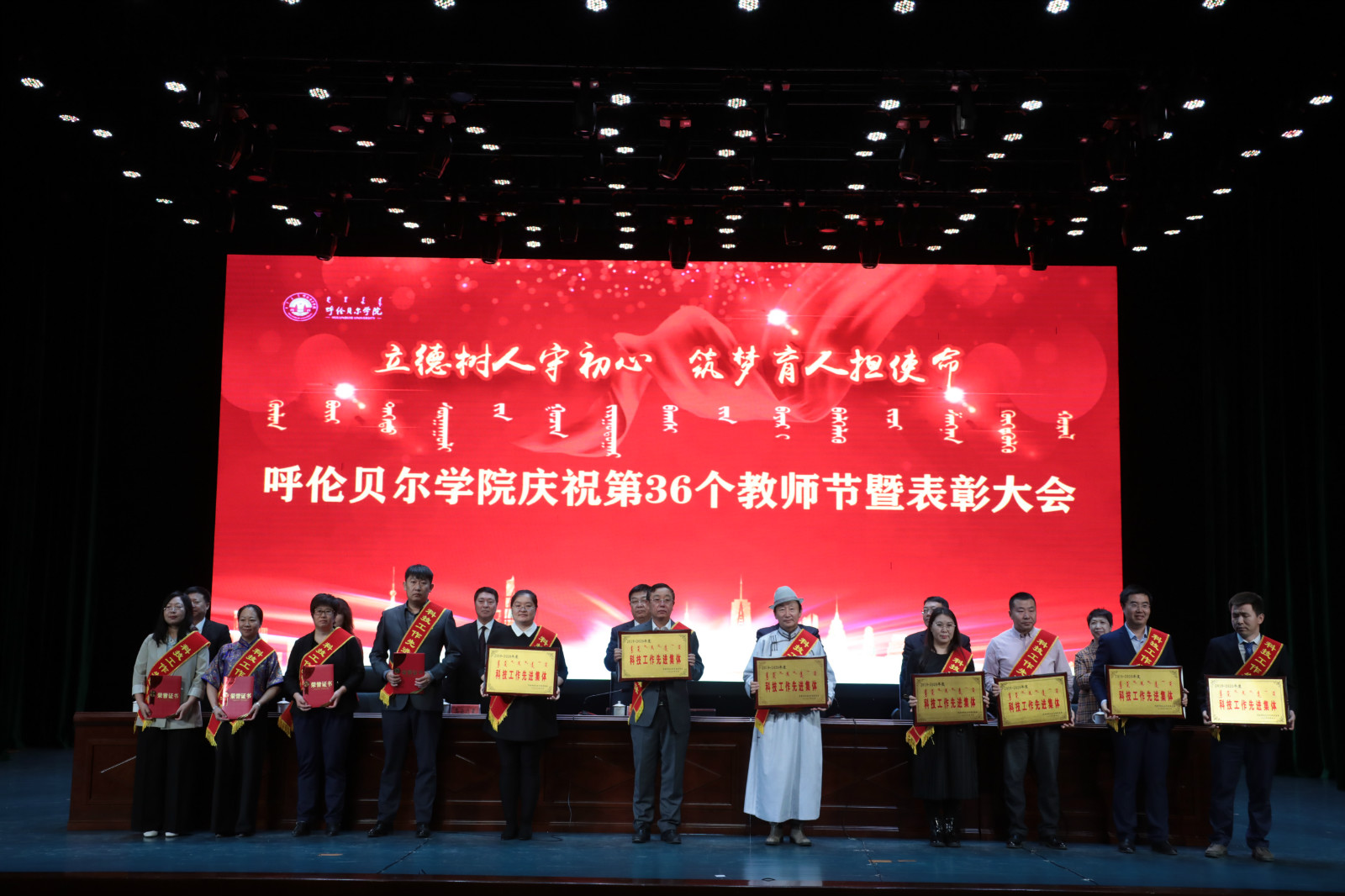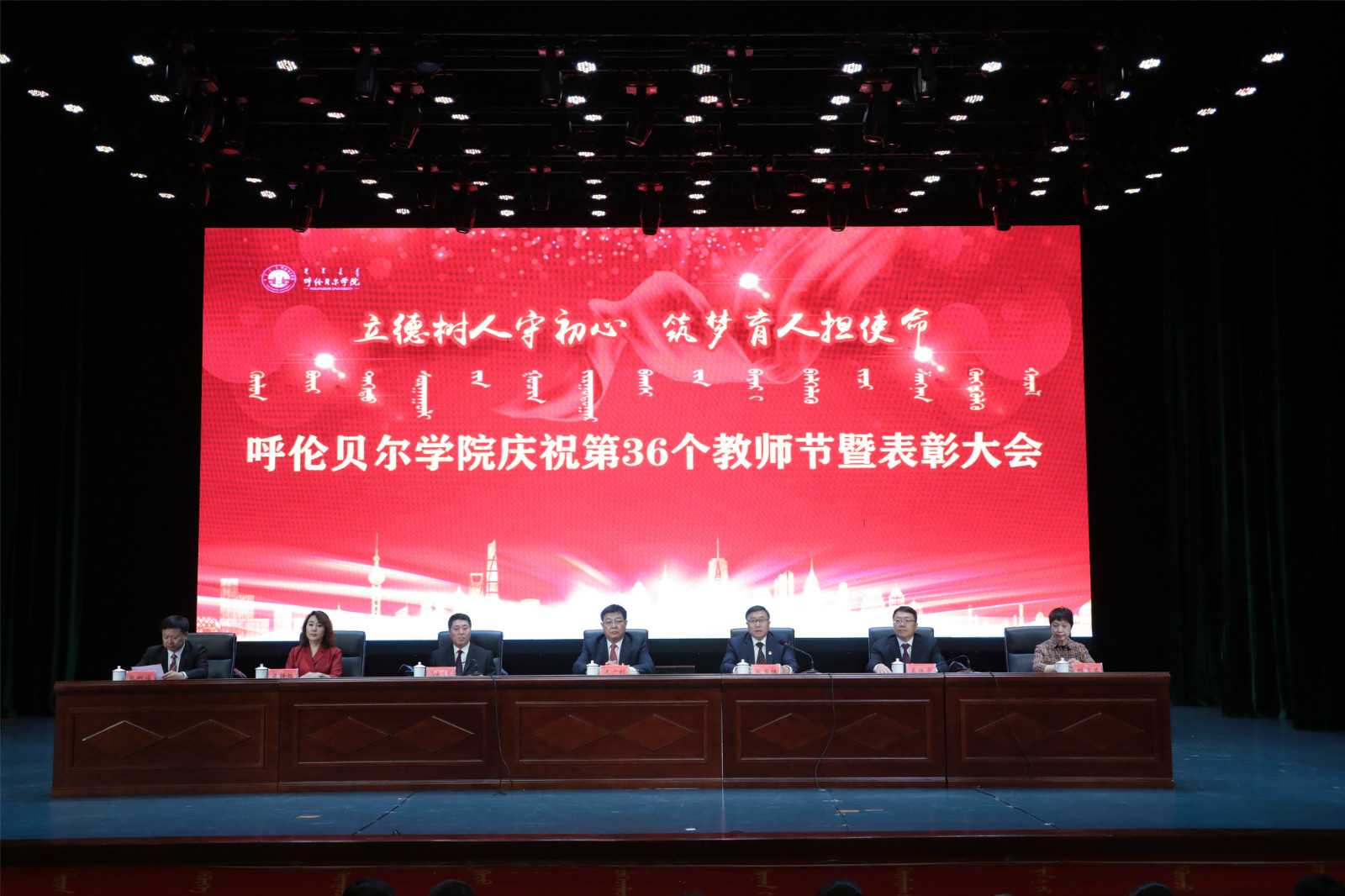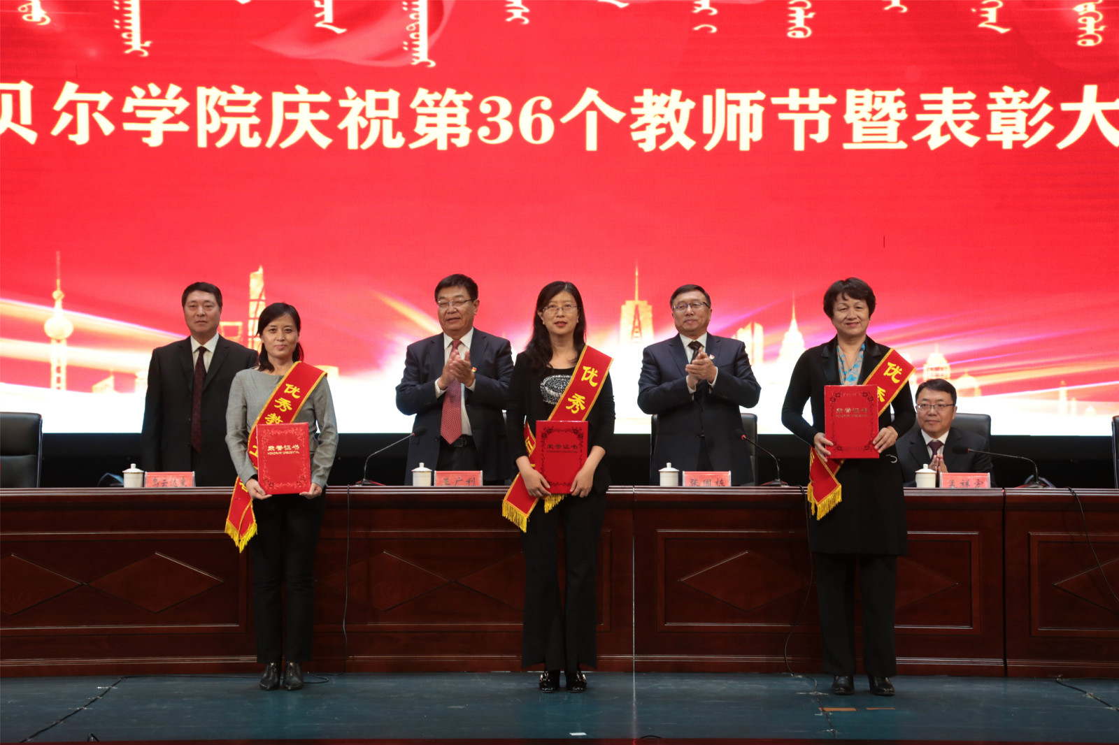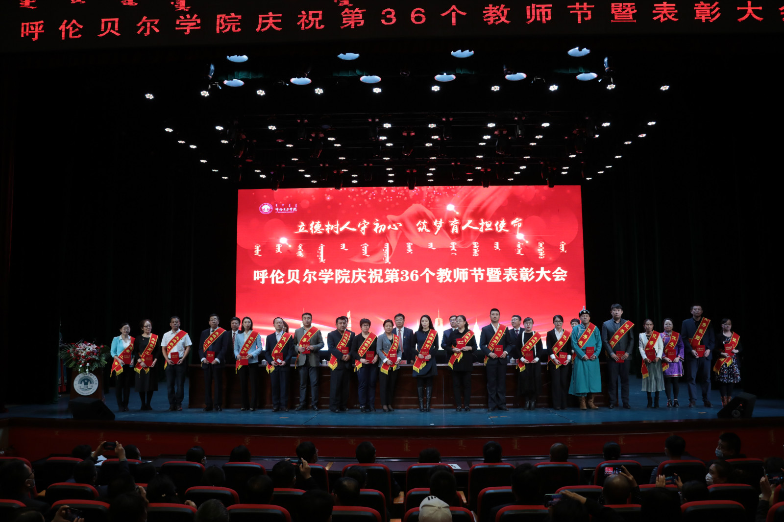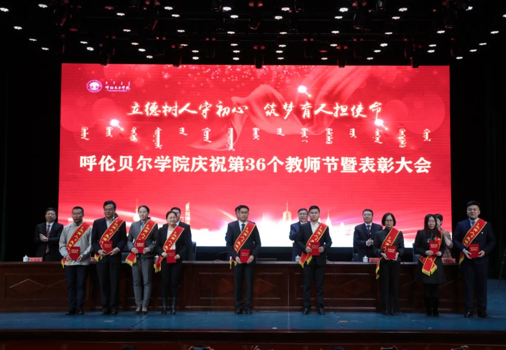 9月10日上午,我校在藝術樓演播廳舉行了“立德樹人守初心 筑夢育人擔使命”慶祝第36個教師節暨表彰大會。校黨委書記王廣利,黨委副書記張國棟,黨委委員、副校長烏云達來、孟祥宏,黨委委員,組織部部長吳靜怡,黨委委員、宣傳部部長劉秀蘭,黨委委員、統戰部部長張樹福,受表彰的先進個人、優秀團隊以及師生代表近500人參加了大會。大會對20個教育先進集體和184名先進個人進行了表彰,會議由黨委副書記張國棟主持。