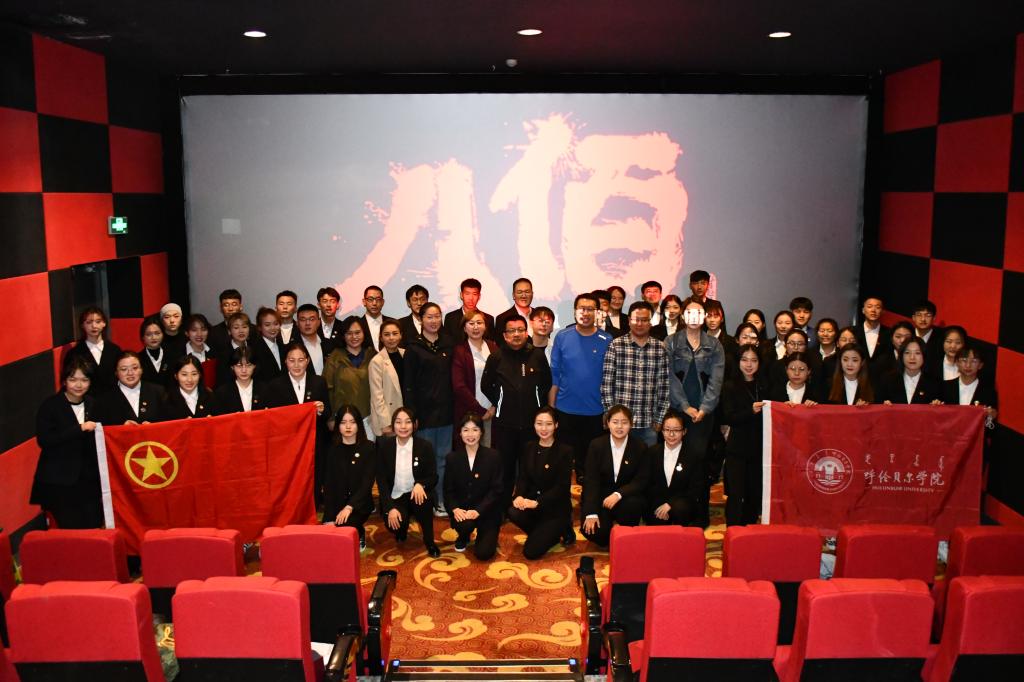 影片開始前全體師生進行集體合影。隨后在場人員認真觀看了電影。電影《八佰》選擇自下而上的底層視角,用專業的素養和一絲不茍的嚴謹態度重現了一段悲壯的歷史,講述了一群熱血兒郎為國捐軀、死而無憾的大無畏精神和家國情懷。