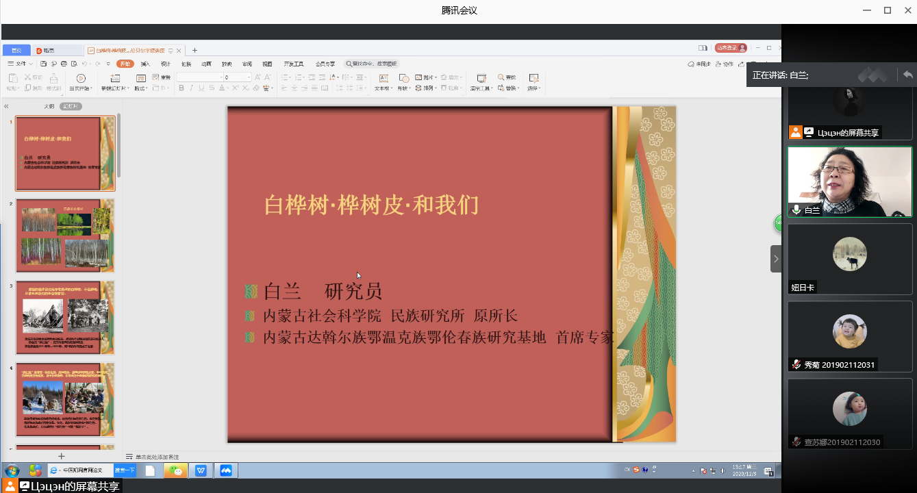 12月9日下午,民族歷史文獻研究中心邀請到內蒙古社會科學院民族研究所原所長、我校兼職教授白蘭研究員作了題為“白樺樹·樺樹皮·和我們”的講座,講座方式為網絡(騰訊會議),由斯仁巴圖主任主持,聆聽講座的有民族歷史文獻研究中心老師們,社會學、歷史學專業的大學生等四十余人。