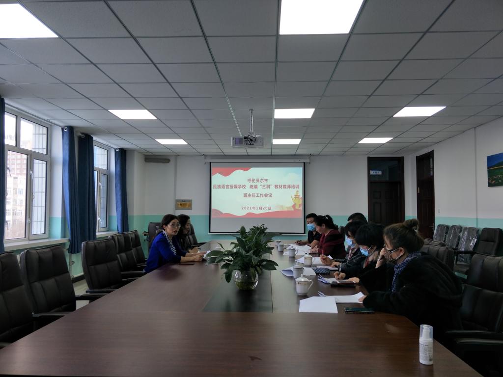 1月26日下午,呼倫貝爾市民族語言授課學校統編“三科”教材教師培訓班主任會議在我校召開,市教育局教師教育科許秀蓮科長、呼倫貝爾學院繼續教育學院莎茹莉院長、負責此次線上結對培訓的班主任、普通話測試員以及督導員參加了會議,