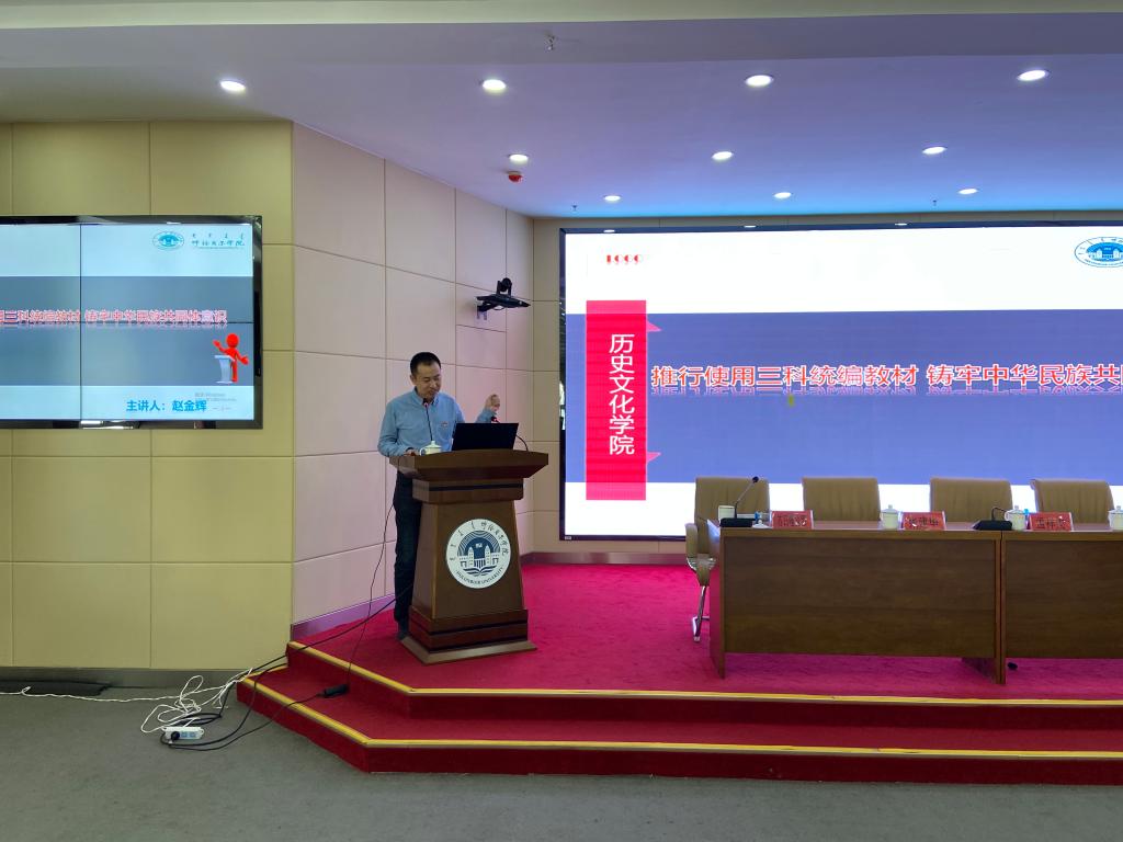 會后,由我校歷史文化學院副院長趙金輝副教授對本次參加支教的學生做了鑄牢中華民族共同體意識的主題培訓。通過此次培訓,支教學生更深刻地認識到三科統編教材是新時代落實立德樹人根本任務,引導學生樹立正確的世界觀、人生觀、價值觀的核心教材,推行使用國家統編教材,有利于讓民族地區各民族群眾享受更加公平、更加有質量的教育,具有重大戰略意義和深遠現實意義。