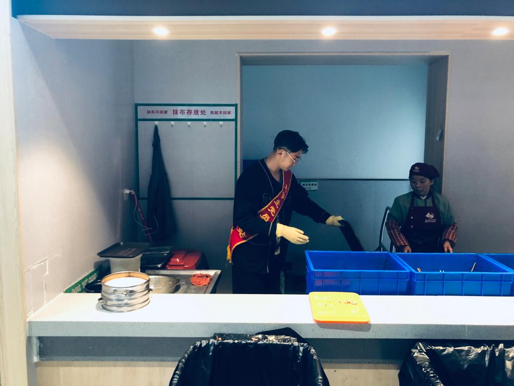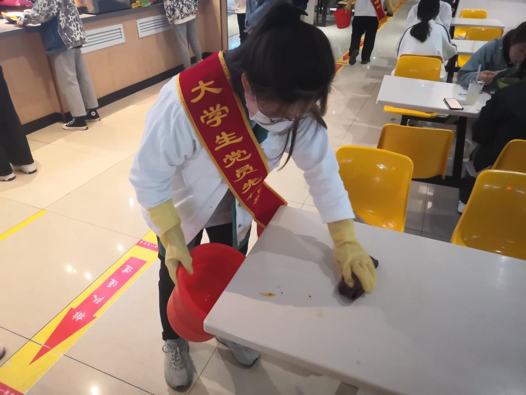 大學生黨員先鋒站的54名黨員和積極分子全員行動,在午餐和晚餐的用餐高峰期積極組織學生自覺排隊,打掃桌面、地面,回收餐具?;顒娱_展以來,同學們不怕苦、不怕臟、不怕累,用實際行動弘揚“奉獻、友愛、互助、進步”的志愿服務精神,踐行“學黨史 悟思想 辦實事 開新局”的要求和全心全意為人民服務的宗旨。