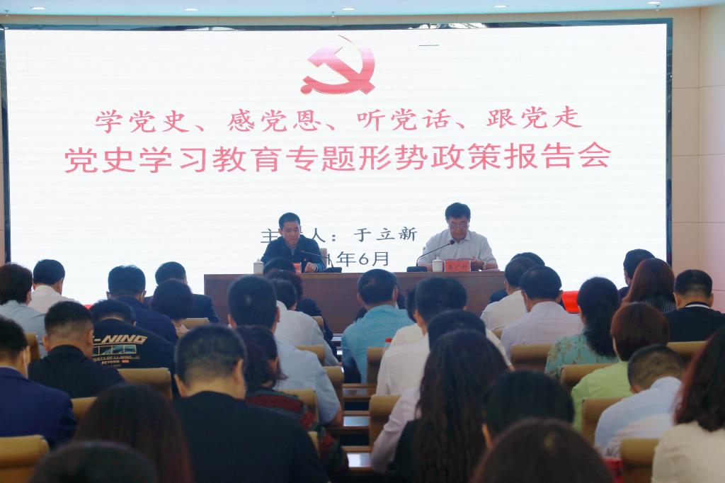 6月23日上午,呼倫貝爾市委書記于立新來校作黨史學習教育專題形勢政策報告會。校黨委書記王廣利主持報告會。呼倫貝爾市委常委、宣傳部部長閆立志,學校領導班子、副處級以上干部、師生黨員代表等近二百人參加了報告會。