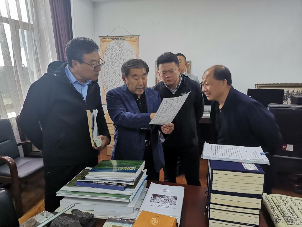 與會專家聽取呼倫貝爾歷史文化遺產與中華民族交往交流交融研究基地建設規劃匯報后參觀了蒙古族族源研究中心。中心負責人孟松林向自治區教育廳領導和與會專家介紹了呼倫貝爾歷史文化遺產和歷史文化研究情況。