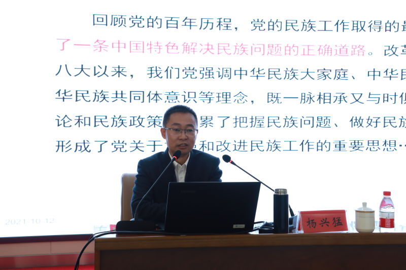 報(bào)告會(huì)上,楊興猛教授以《學(xué)習(xí)貫徹中央民族工作會(huì)議精神 進(jìn)一步鑄牢中華民族共同體意識(shí)》為題,從“黨關(guān)于加強(qiáng)和改進(jìn)民族工作的重要思想”“鑄牢中華民族共同體意識(shí)的深刻內(nèi)涵和重大意義”“鑄牢中華民族共同體意識(shí)的‘四大關(guān)系’和‘五項(xiàng)任務(wù)’”“切實(shí)加強(qiáng)黨對(duì)民族工作的全面領(lǐng)導(dǎo)”四個(gè)方面作了系統(tǒng)深入的宣講。