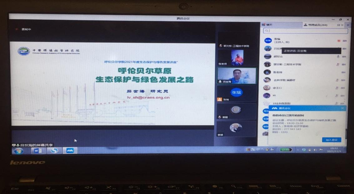 為了籌備建立我校綠色發展研究中心,進一步明確研究方向,經過校內籌備會討論后,11月3日,中國環境科學研究院研究員、環境生態學科首席專家呂世海研究員應邀為我校開展題為“呼倫貝爾草原生態保護與綠色發展之路”線上講座。校黨委委員、副校長敖特根,科學技術處處長田振江,相關二級院系的院長和老師共320余人參加了本次講座,科學技術處副處長張桂芝主持講座。