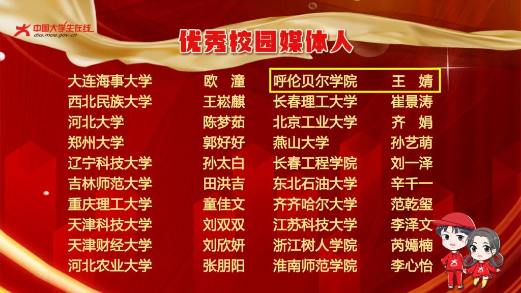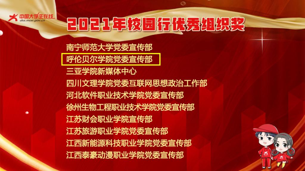 1月14日,由教育部中國大學生在線主辦的“創新引領,聚力青春向未來”2021年度校園號建設研討會暨校網通工作年會通過騰訊會議在線上舉行,來自全國近300所高校的千余名師生代表參加會議。會議揭曉了中國大學生在線2021年度校網通站及校園行活動表彰名單。作為自治區唯一獲獎高校,呼倫貝爾學院校網通站榮獲“優秀校網通站”,我校黨委宣傳部獲得“2021年校園行優秀組織獎”,推送的文章《呼倫貝爾學院“原上鷹”話劇團<紅色交通線>在藝術樓音樂廳首演》獲得“年度優秀內容榜單”,宣傳部副部長張陽榮獲“校網通優秀指導教師”,校網通駐站記者王婧同學獲得“優秀校園媒體人”。評選綜合考核各校網通站本年度投稿情況、優秀原創內容、合作專題專欄和新媒體建設等方面,評選出“十佳校網通站”10所,“優秀校網通站”60所;評選出“十佳指導教師”10名,“優秀指導教師”60名;評選出“十佳校園媒體人”10名,優秀校園媒體人70名。另設立年度影響力內容、年度優秀內容等獎項。