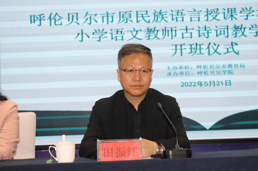 在開班儀式上,田振江副校長致辭并講話。他強調,推行使用國家統編教材是黨中央作出的重大決策部署,對開好“三科”教學、用好教材、實施好“鑄魂工程”具有特殊意義。呼倫貝爾學院作為項目承辦單位,責任重大,使命光榮。學校將嚴格按照教育部和自治區教育廳的有關要求,不斷開發優質課程資源,創新培訓模式與培訓內容,提升培訓質量和效果。針對本次培訓,他要求:一是參訓人員要站穩政治立場,充分認識到本次專題培訓的重要意義;二是從講政治的高度自覺鑄牢中華民族共同體意識,把人民教師這份神圣職責落實到教書育人的全過程;三是用知識、能力、智慧和情感積極承擔起推行使用國家統編教材的重大使命,為推進呼倫貝爾市教育教學的高質量發展貢獻力量。