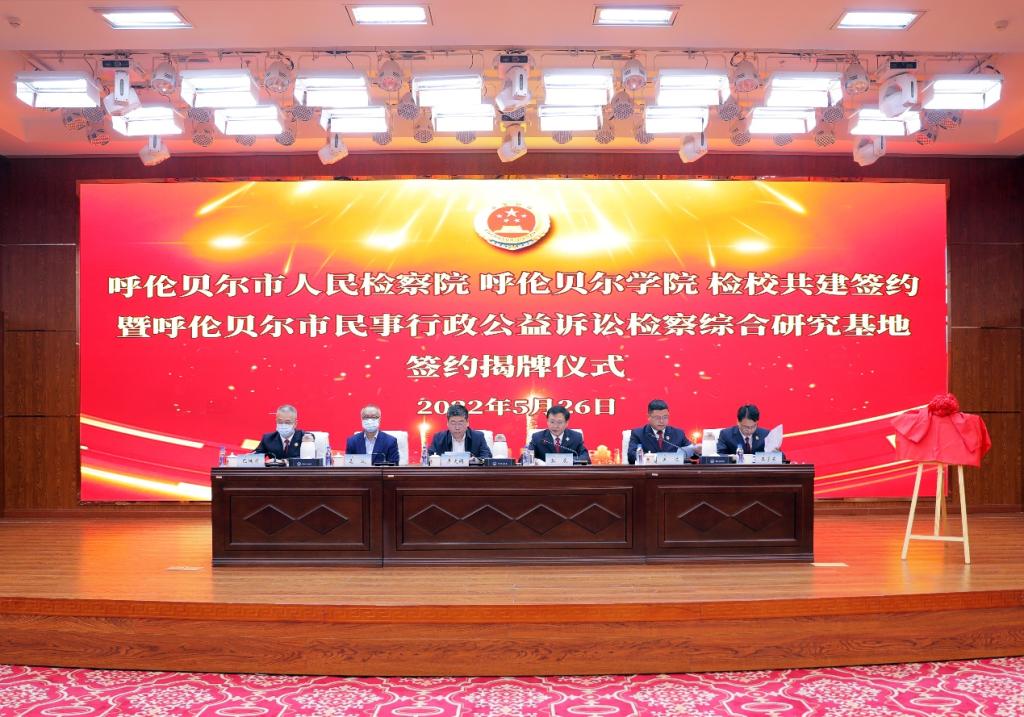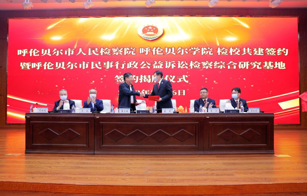 會(huì)上,李文閣校長(zhǎng)和秦虎檢察長(zhǎng)共同簽署了《檢校共建協(xié)議書》《呼倫貝爾市民事行政公益訴訟檢察綜合研究基地合作協(xié)議書》,并為呼倫貝爾市民事行政公益訴訟檢察綜合研究基地揭牌。