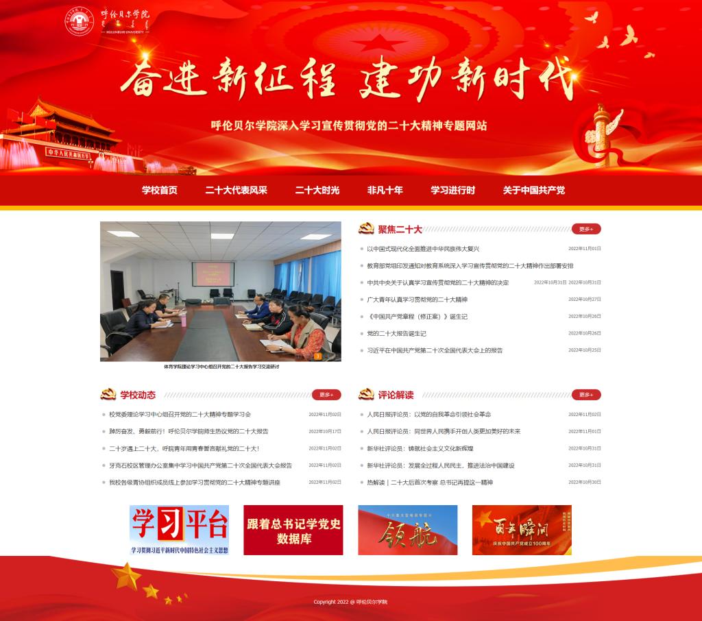 中國(guó)共產(chǎn)黨第二十次全國(guó)代表大會(huì)于10月16日至22日在北京舉行。這是在全黨全國(guó)各族人民邁上全面建設(shè)社會(huì)主義現(xiàn)代化國(guó)家新征程、向第二個(gè)百年奮斗目標(biāo)進(jìn)軍的關(guān)鍵時(shí)刻召開(kāi)的一次十分重要的大會(huì),是一次高舉旗幟、凝聚力量、團(tuán)結(jié)奮進(jìn)的大會(huì)。為使全校師生全面地了解和掌握大會(huì)進(jìn)展,領(lǐng)會(huì)大會(huì)精神,掀起學(xué)習(xí)宣傳貫徹落實(shí)大會(huì)精神熱潮,11月2日,呼倫貝爾學(xué)院深入學(xué)習(xí)宣傳貫徹黨的二十大精神專題網(wǎng)站正式上線。