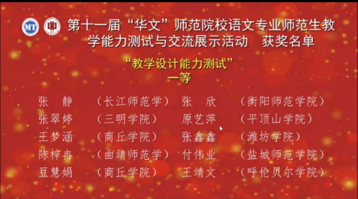 我校文學院經校內預選推選漢語言文學專業2019級李叢、2020級王靖文、范紫璐、周彤四名選手參加比賽,經過異彩紛呈的測試與交流展示,李叢獲得教學片段設計能力一等獎,范紫璐、周彤、王靖文獲得教學片段設計能力三等獎;李叢獲得教學能力測試二等獎,范紫璐、周彤獲得教學能力測試三等獎,王靖文獲得教學能力測試優秀獎。