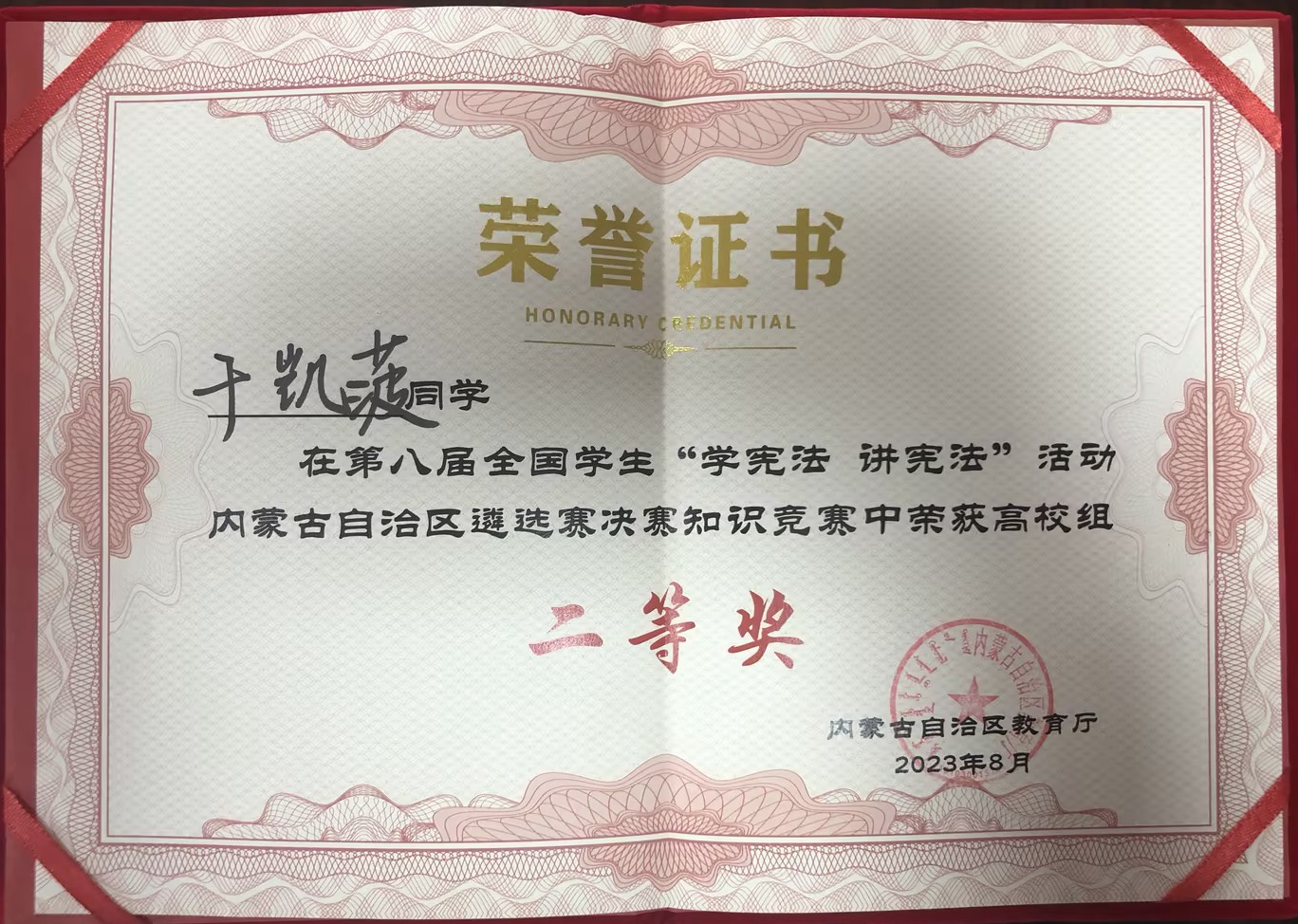 8月26日至28日,第八屆全國學生“學憲法 講憲法”活動內蒙古自治區遴選賽在呼和浩特市舉行。我校法學與經濟管理學院學生于凱菠在知識競賽決賽中榮獲二等獎。