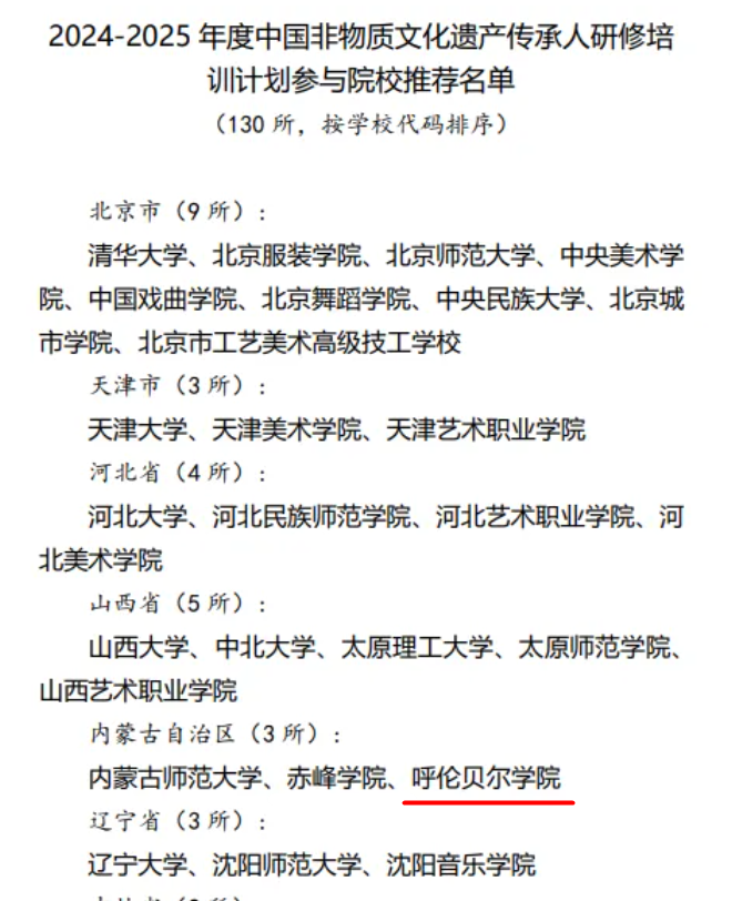 10月7日,文化和旅游部公布了《2024-2025年度中國非物質文化遺產傳承人研修培訓計劃參與院校推薦名單》,全國共有130所院校入選推薦名單,其中,內蒙古自治區共有包括我校在內的三所高校入選。