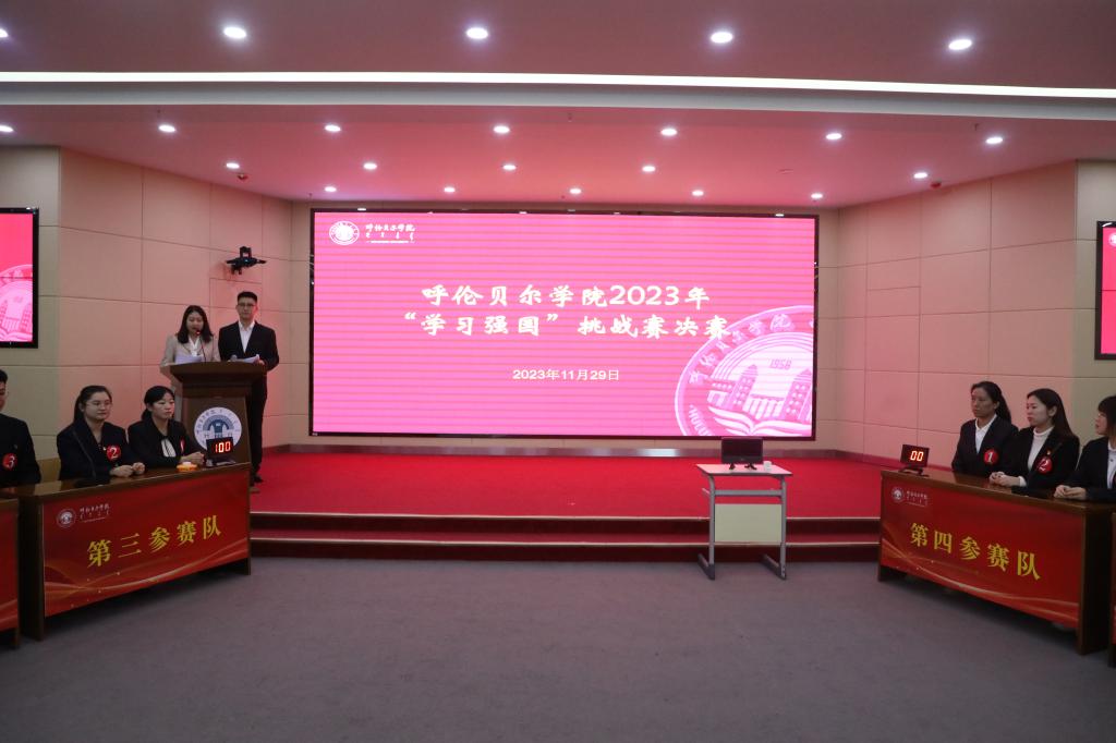 為進一步推動理論學(xué)習(xí)走深走實,不斷擴大“學(xué)習(xí)強國”學(xué)習(xí)平臺的覆蓋面和參與度,激發(fā)學(xué)習(xí)熱情,11月29日下午,在崇文樓A座201會議室,我校舉行“以賽促學(xué)強思想·以學(xué)促干求實效”—“學(xué)習(xí)強國”挑戰(zhàn)賽決賽。校黨委副書記張宏天,“學(xué)習(xí)強國”呼倫貝爾市學(xué)用管理專班負責(zé)人、市委宣傳部理論科科長孔令強,“學(xué)習(xí)強國”呼倫貝爾市學(xué)用管理專班學(xué)用推廣工作負責(zé)人肖洋,各學(xué)院、部門領(lǐng)導(dǎo)及參賽選手120余人觀看了比賽。