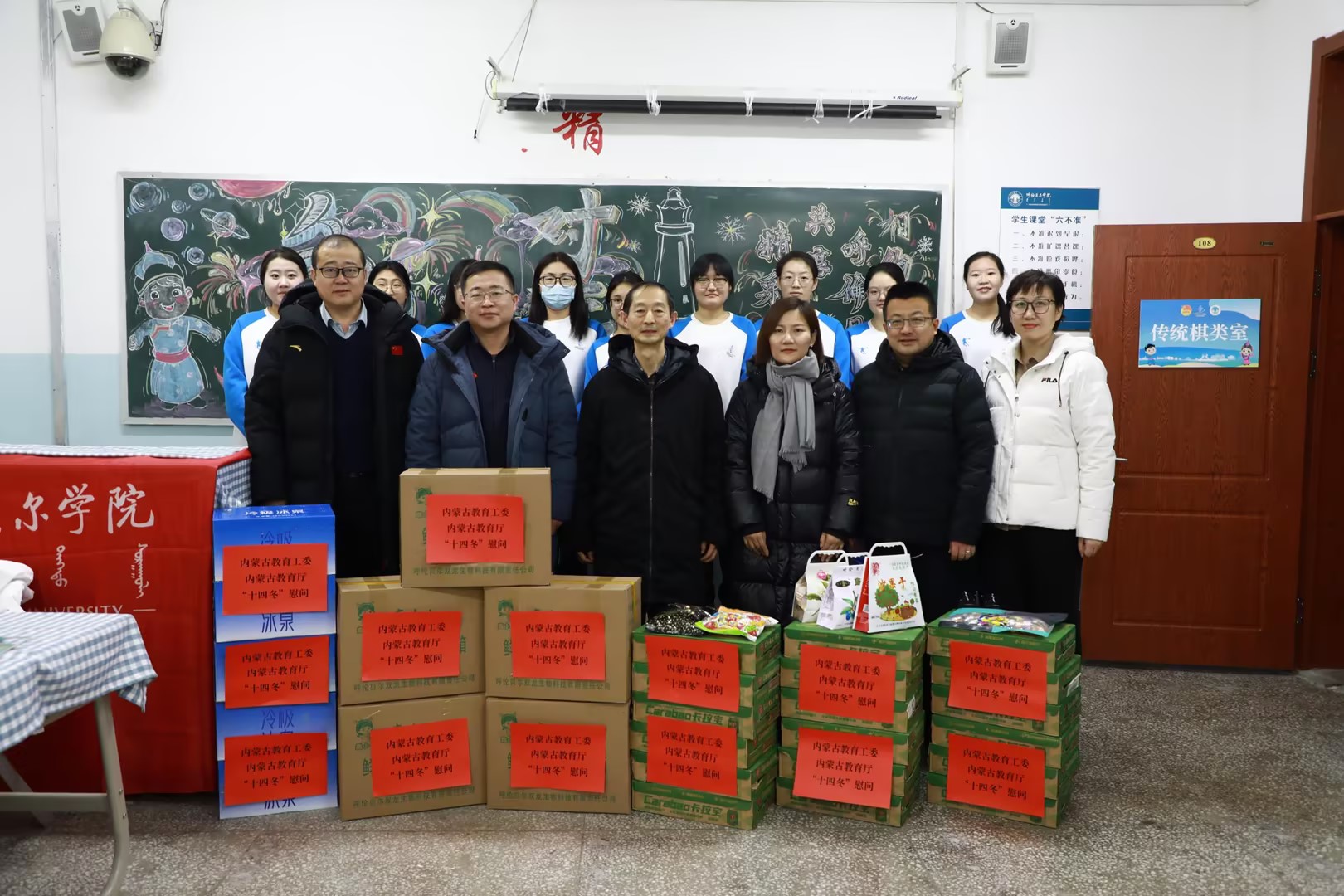 1月28日,自治區教育廳二級巡視員武福英、學生工作處副處長劉惠到我校慰問“十四冬”志愿者。呼倫貝爾市政府黨組成員、副市長馬躍東,校黨委副書記張宏天及我校相關職能部門負責人陪同慰問。