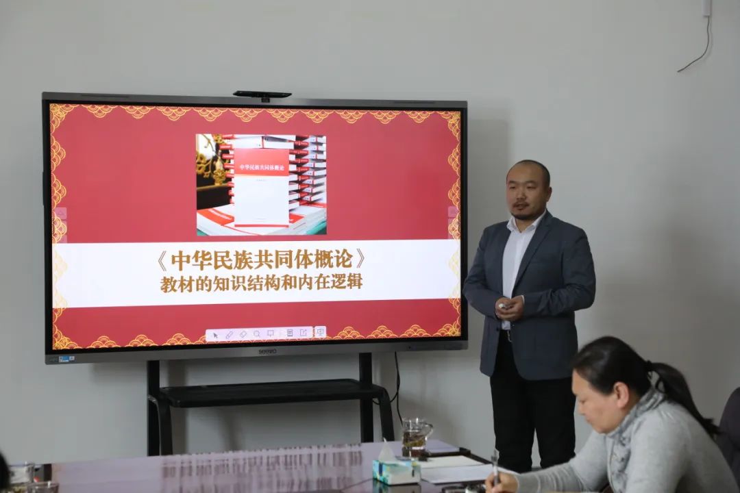 課程骨干教師張舒主持了《中華民族共同體概論》集體備課,圍繞教材的知識結構和內在邏輯等方面給出了備課建議,部分思政課教師代表作了點評。