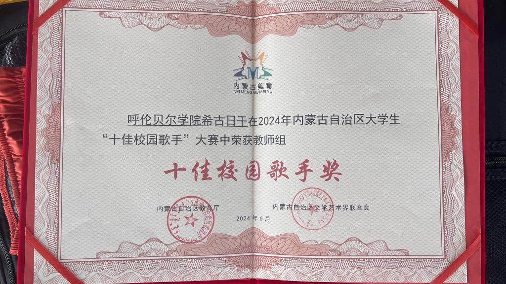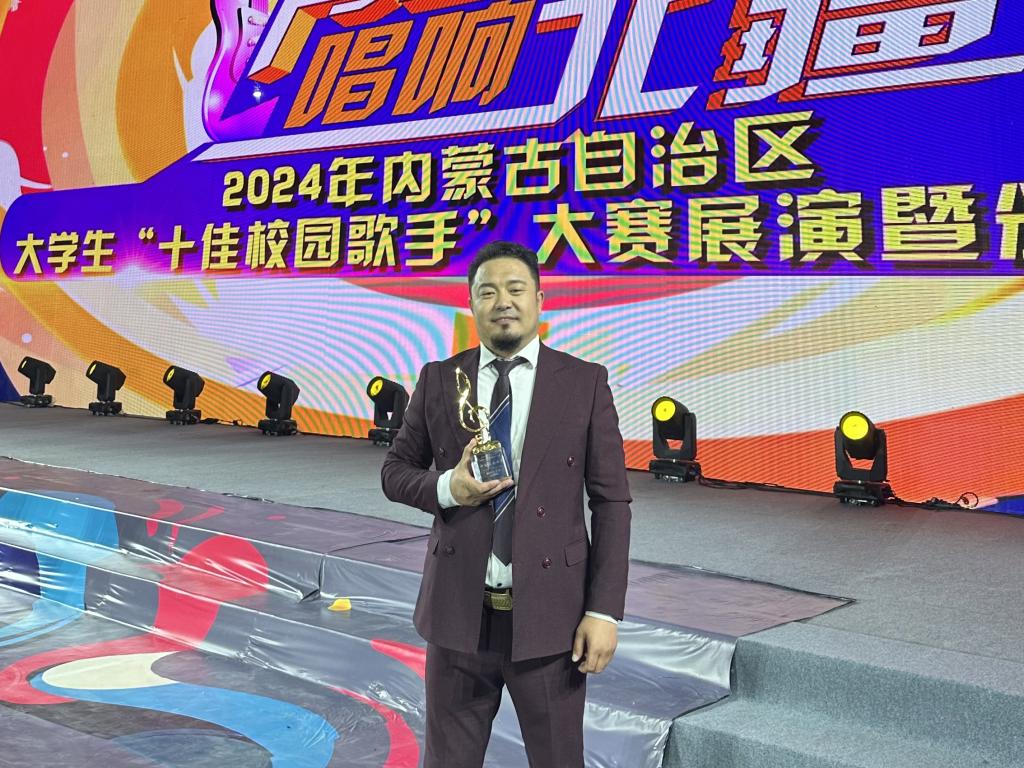 經過現場的激烈角逐,希古日干以業余組第二名的好成績榮獲“十佳校園歌手”稱號,姜婷榮獲業余組“十佳校園歌手提名獎”榮譽稱號,我校榮獲“優秀組織獎”。比賽期間,希古日干參加了2024年內蒙古自治區大學生“十佳校園歌手”大賽展演暨頒獎儀式,充分展示了我校青年教師積極向上的青春風采。