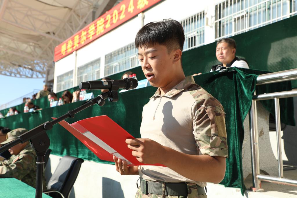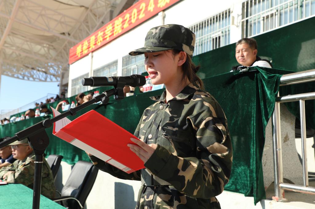 外國語學院趙蕾代表2024級新生發言,她號召全體同學堅決服從指揮、保質保量完成軍訓任務,尊重教官、團結同學,以最飽滿的精神迎接軍訓,以汗水為墨,橄欖綠為筆,揮灑出一首陽光下最壯麗的青春詩篇。