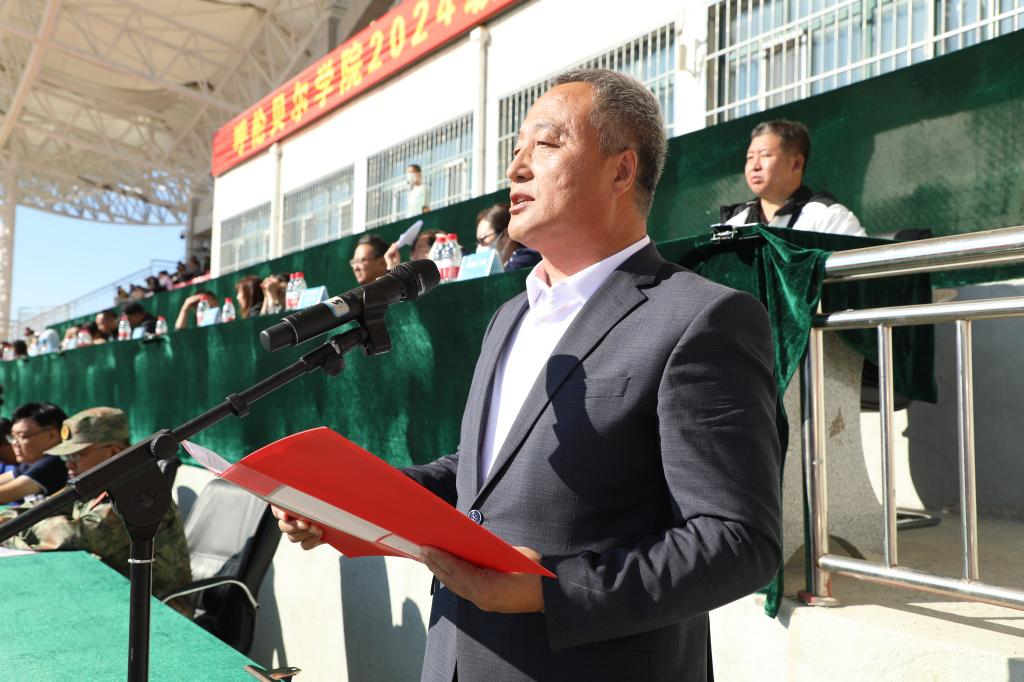 郝新君宣布呼倫貝爾學院2024級新生動員大會正式開始,他表示,2024級新生軍訓的號角已經吹響,相信經過高考磨煉的同學們,在經過21天的軍訓后,會更加成熟、穩重而自信。新的起點,新的希望,新的期待,讓大家攜起手來,齊心協力,共同創造呼院更加輝煌的明天!