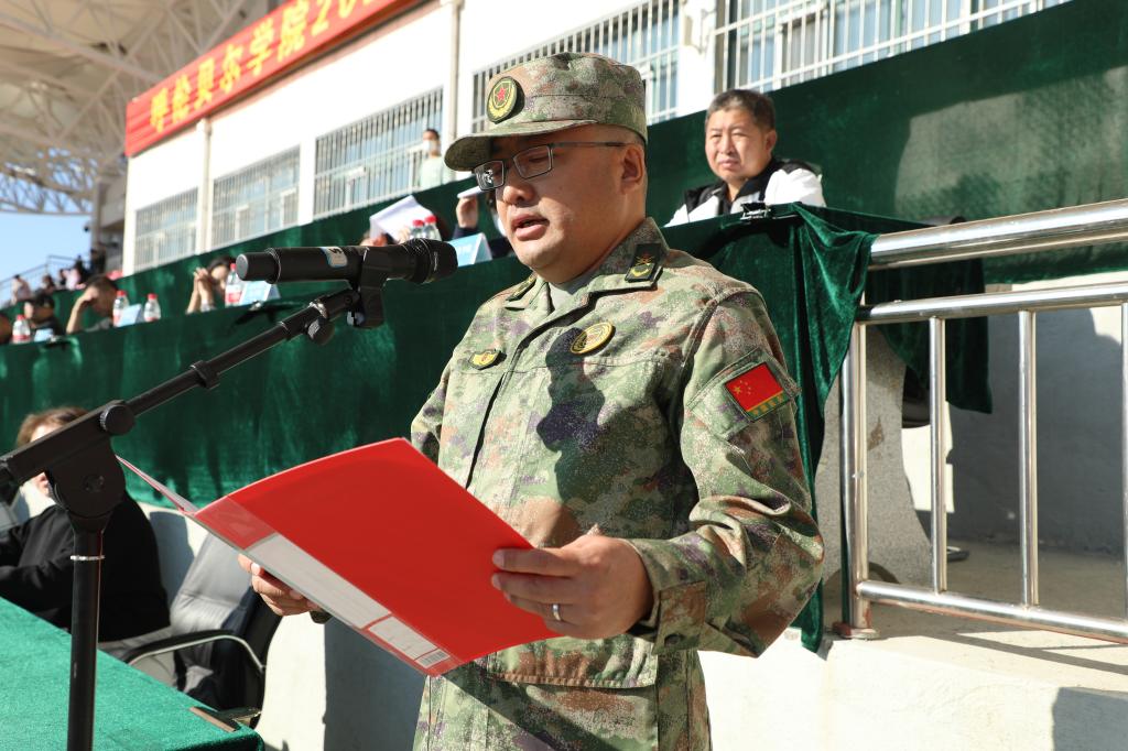 朱泓霖代表軍訓教官發言,他承諾,全體教官將以高度的責任感和使命感,嚴格要求自己,認真履行教官職責。以科學的訓練方法、嚴謹的教學態度,為同學們傳授軍事知識和技能,以身作則,言傳身教,為同學們樹立良好的榜樣。同時,也希望同學們以飽滿的熱情、昂揚的斗志投入到訓練當中,在軍訓中收獲滿滿,為自己的青春增添一抹亮麗的色彩!