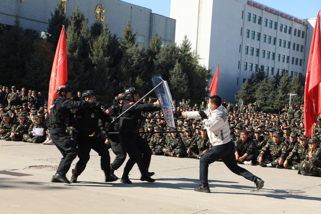 演練首先模擬了火災(zāi)突發(fā)事件,學(xué)生們?cè)谙谰瘓?bào)聲中,用濕毛巾捂住口鼻,沿預(yù)定路線快速疏散至安全地帶。接著,進(jìn)行了反恐處突演練,特警隊(duì)員迅速制服了“恐怖分子”,并展示了破八刀和刀功持槍技術(shù)。然后,進(jìn)行了70米登高平臺(tái)消防車登高救人演練,體現(xiàn)了消防救援人員之間相互配合、協(xié)同作戰(zhàn)的能力。最后,進(jìn)行了反詐宣傳工作,呼吁同學(xué)們共同抵制買賣“兩卡”行為,維護(hù)社會(huì)平安。