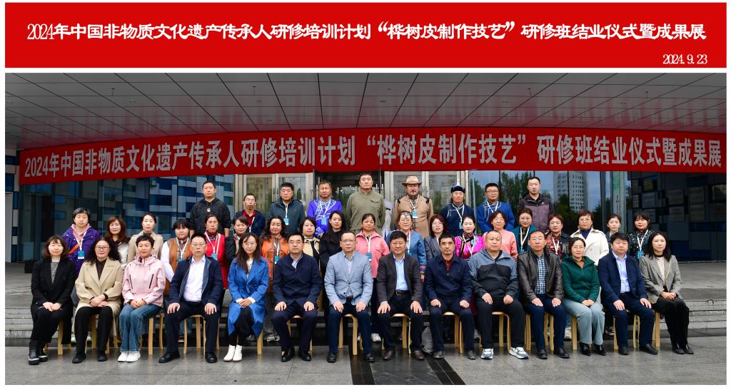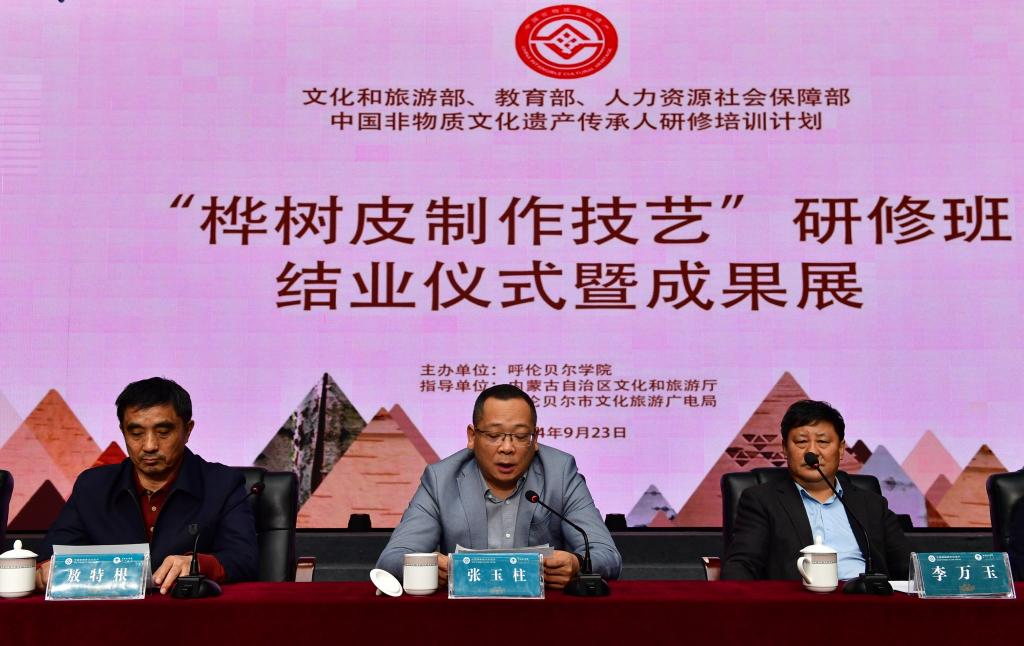 2024年,由文化和旅游部、教育部、人力資源和社會(huì)保障部主辦、內(nèi)蒙古自治區(qū)文化和旅游廳作為指導(dǎo)單位、呼倫貝爾學(xué)院承辦的中國(guó)非物質(zhì)文化遺產(chǎn)傳承人研修培訓(xùn)計(jì)劃“樺樹(shù)皮制作技藝”培訓(xùn)班在經(jīng)過(guò)一系列深入而系統(tǒng)的培訓(xùn)后,于9月23日上午在呼倫貝爾市文化館舉辦了結(jié)業(yè)儀式暨成果展。呼倫貝爾學(xué)院黨委副書(shū)記、校長(zhǎng)張玉柱,校黨委委員、副校長(zhǎng)敖特根,內(nèi)蒙古自治區(qū)文化和旅游廳二級(jí)調(diào)研員李萬(wàn)玉,呼倫貝爾市文化旅游廣電局黨組成員、副局長(zhǎng)張本磊,呼倫貝爾市美術(shù)館、呼倫貝爾市文化館館長(zhǎng)、市非遺保護(hù)中心主任崔曉明,呼倫貝爾學(xué)院相關(guān)部門(mén)負(fù)責(zé)人,“非遺班”全體學(xué)員,美術(shù)學(xué)院、旅游地理與歷史文化學(xué)院、教育學(xué)院、蒙古學(xué)學(xué)院的師生代表參加結(jié)業(yè)儀式。結(jié)業(yè)儀式由呼倫貝爾學(xué)院鄉(xiāng)村振興研究中心主任張玉樁主持。