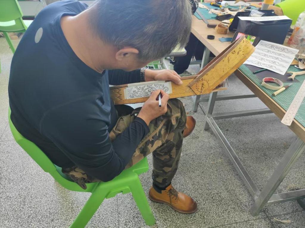 9月17日至21日,是研修班最為關鍵的分組實踐創(chuàng)作階段。每每走進教室,空氣中彌漫著淡淡的樺樹皮特有的清香,讓人心曠神怡。每位學員都要經(jīng)歷樺樹皮的采集、處理,作品的設計、雕刻、拼接等環(huán)節(jié)。首先,學員們從準備好的樺樹皮堆中挑選出質(zhì)地優(yōu)良、紋理清晰的原材料。他們端詳著每一片樹皮,用手指輕輕觸摸其表面,感受其獨特的質(zhì)感和溫度。挑選完畢后,學員們使用特制的刀具,小心翼翼地沿著樹皮的紋理進行裁剪,確保每一片都符合設計需求。