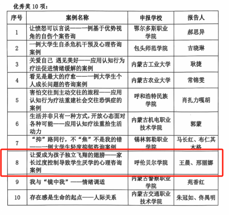 近日,內蒙古高教學會大學生心理教育專業委員會組織開展的大學生心理咨詢典型案例申報評選工作結果公布,我校教師謝春輝、王晨雪撰寫的《拒絕內耗 知行合一——應用元認知干預技術解決學習動機缺失的案例》榮獲一等獎,王晨、邢麗娜撰寫的《讓愛成為孩子獨立飛翔的翅膀——家長過度控制導致學生厭學的心理咨詢案例》榮獲優秀獎。