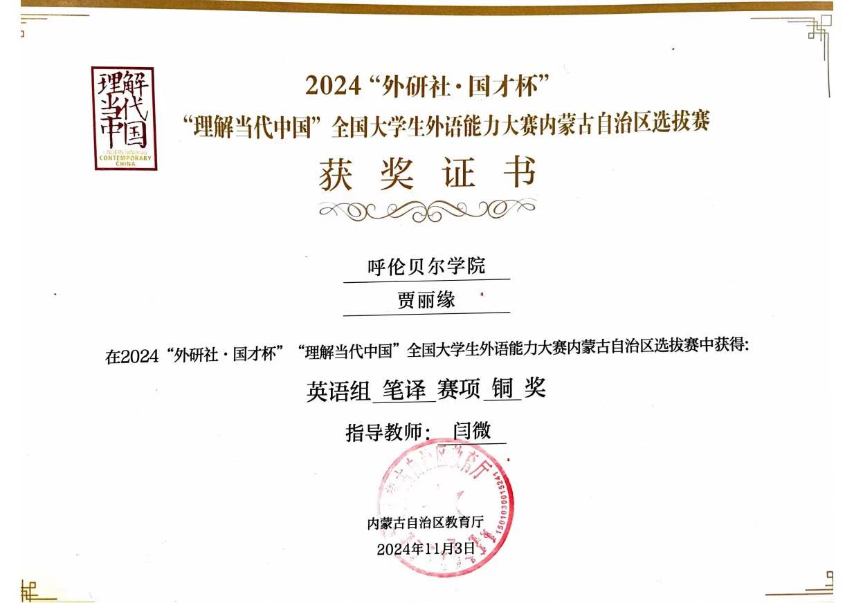 11月2日至3日,由內(nèi)蒙古自治區(qū)教育廳主辦、內(nèi)蒙古大學(xué)承辦的2024“外研社?國才杯”“理解當(dāng)代中國”全國大學(xué)生外語能力大賽內(nèi)蒙古自治區(qū)選拔賽決賽成功舉辦。本次大賽匯集了區(qū)內(nèi)19所大學(xué)及28所高等職業(yè)技術(shù)學(xué)院的優(yōu)秀學(xué)子,他們圍繞短視頻、綜合能力、演講、口譯、筆譯五個賽項(xiàng)展開了激烈的角逐。我校礦業(yè)與化學(xué)化工學(xué)院2022級化學(xué)專業(yè)賈麗緣同學(xué)在英語組筆譯項(xiàng)目中表現(xiàn)出色,榮獲銅獎。