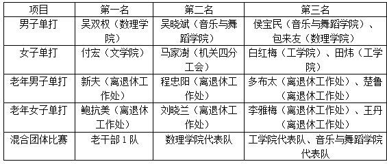 經過各部門初賽的層層選拔,來自基層工會11支代表隊的98名教職工進入了復賽。經過兩天77場比賽,最終,男子/女子單打、老年男子/女子單打和混合團體比賽決出了前三名。呂根和孫桂平為他們一一進行頒獎。
