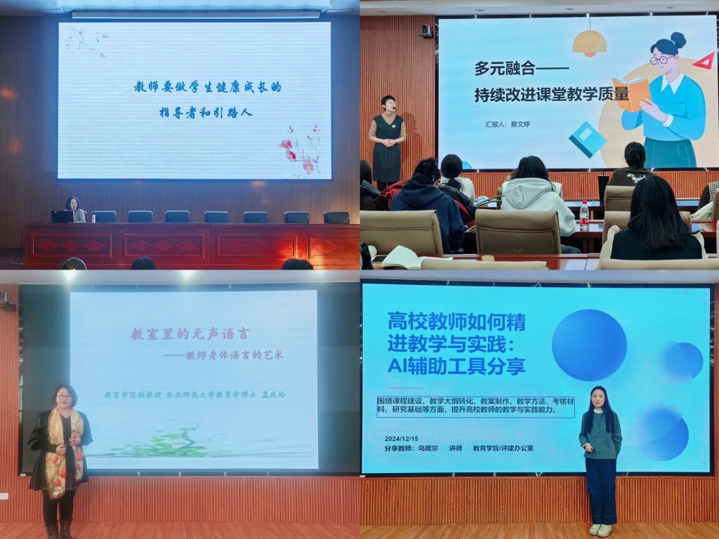 此外,在教育理念方面,法學與經濟管理學院李雪峰教授主講的“教師要做學生健康成長的指導者和引路人”課程,深入探討了教師的角色與責任;文學院蔡文婷副教授主講的“多元融合:持續改進課堂教學質量”課程,鼓勵教師采用多元化教學策略,提升課堂教學質量;教育學院孟慶玲副教授分享了“教室里的無聲語言——高校教師的身體語言藝術”課程,專注于教師的非言語溝通技巧;教育學院烏妮爾老師則結合教學實踐,分享了“高校教師如何精進教學與實踐”課程,指導教師如何在日常教學中不斷精進。
