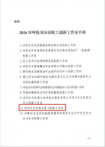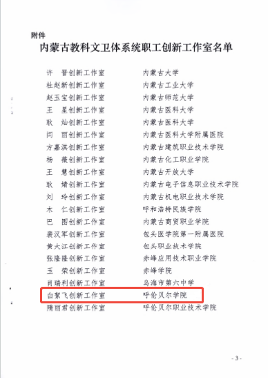 近日,自治區(qū)教科文衛(wèi)體工會(huì)及呼倫貝爾市總工會(huì)進(jìn)行了創(chuàng)新工作室評(píng)選,我校白絮飛創(chuàng)新工作室獲評(píng)“2024年教科文衛(wèi)體系統(tǒng)職工創(chuàng)新工作室”和“呼倫貝爾市職工創(chuàng)新工作室”。