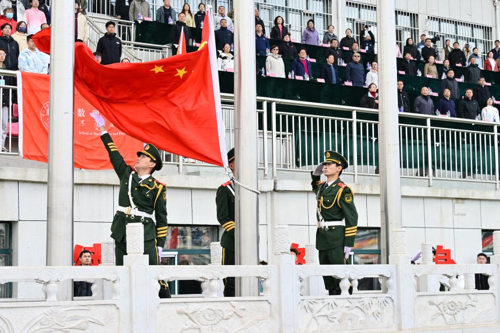 英姿颯爽的國旗護衛隊護送鮮艷的五星紅旗緩緩走來,步伐鏗鏘有力。全體師生莊嚴肅立,向國旗行注目禮,在雄壯的國歌聲中,鮮艷的五星紅旗冉冉升起,全場師生齊唱國歌。這一刻,愛國之情在每個人心中激蕩,讓青春與家國情懷緊緊相連。