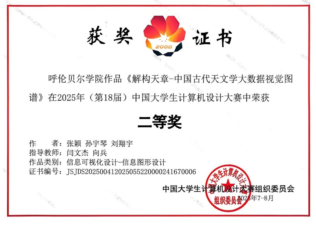 此次賽事中,我校學(xué)子的優(yōu)異表現(xiàn)離不開師生團(tuán)隊(duì)的協(xié)同攻堅(jiān)。自賽事啟動(dòng)以來,由張穎、孫宇琴、劉翔宇等同學(xué)組成的參賽團(tuán)隊(duì),在指導(dǎo)教師的全程悉心指導(dǎo)下,投入大量時(shí)間與精力打磨作品。從最初的選題構(gòu)思到后續(xù)的方案完善,師生們反復(fù)推敲作品的框架與細(xì)節(jié);為了達(dá)到最佳呈現(xiàn)效果,團(tuán)隊(duì)成員對(duì)每一個(gè)技術(shù)環(huán)節(jié)、每一段演示內(nèi)容都精益求精,歷經(jīng)數(shù)輪修改優(yōu)化。最終,憑借這份執(zhí)著與努力,作品《解構(gòu)天章—中國(guó)古代天文學(xué)大數(shù)據(jù)視覺圖譜》《數(shù)字技術(shù)賦能的馬頭琴交互信息設(shè)計(jì)》分別榮獲信息可視化設(shè)計(jì)類二等獎(jiǎng)、三等獎(jiǎng)。