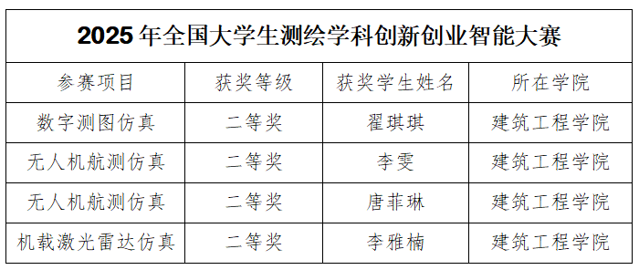 近日,2025 年全國大學生測繪學科創新創業智能大賽在激烈角逐后圓滿落幕。作為全國測繪學科領域極具權威性與影響力的賽事,本次大賽吸引了全國近400所高校的7000余名學子同臺競技,集中展示了當代大學生在測繪科技創新領域的前沿探索與實踐成果。我校建筑工程學院12名學子憑借扎實的專業素養與創新思維脫穎而出,在多個賽道嶄露頭角:數字測圖仿真賽道斬獲二等獎1項,無人機航測仿真賽道喜獲二等獎2項,機載激光雷達仿真賽道再添二等獎1項。