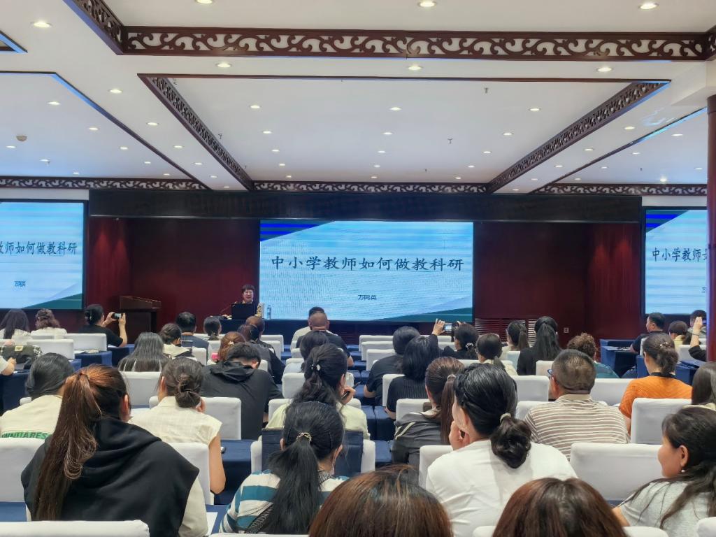 開班儀式結束后,我校數理學院院長萬阿英教授以《中小學教師如何做教科研》為題,為參訓教師作專題講座。萬阿英從教育科研的重要意義、核心方法策略與實踐路徑等方面進行系統講解,為參訓教師搭建了“教學實踐與教科研融合”的思路框架,助力教師提升教科研能力,為后續教育教學創新奠定基礎。