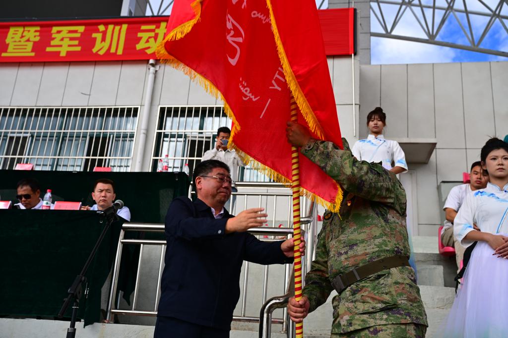 在激昂雄壯的分列式進行曲中,校黨委書記李文閣為軍訓教官授旗。接過旗幟的瞬間,全體承訓教官精神抖擻、莊嚴敬禮,這面旗幟不僅承載著軍訓任務的使命,更凝聚著學校對新生成長的殷切期望。