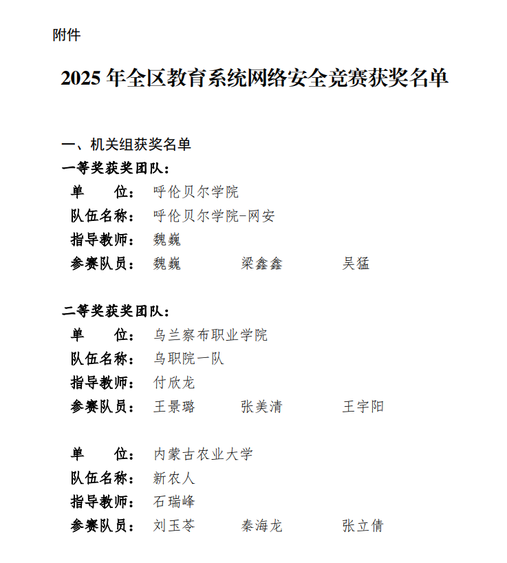在自治區黨委網信辦的指導下,由自治區教育廳主辦的2025年全區教育系統網絡安全競賽于8月30日在呼和浩特市圓滿落幕。我校派出由網絡中心魏巍、梁鑫鑫、吳猛三位教師組成的“呼倫貝爾學院-網安”代表隊參賽,經過激烈角逐,最終斬獲機關組一等獎。
