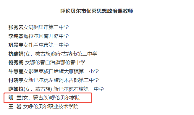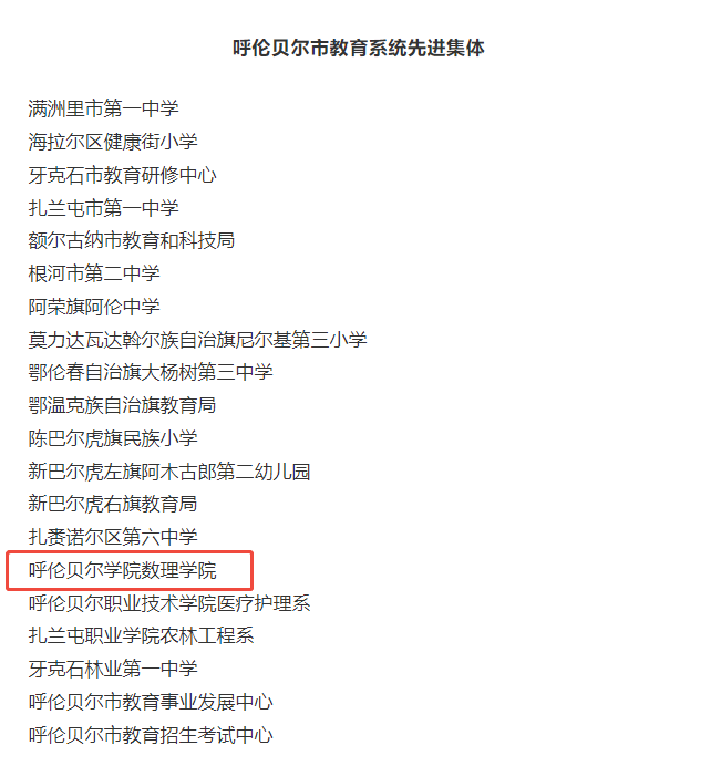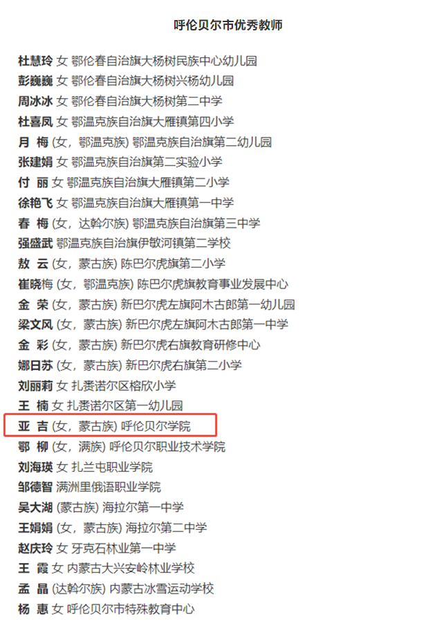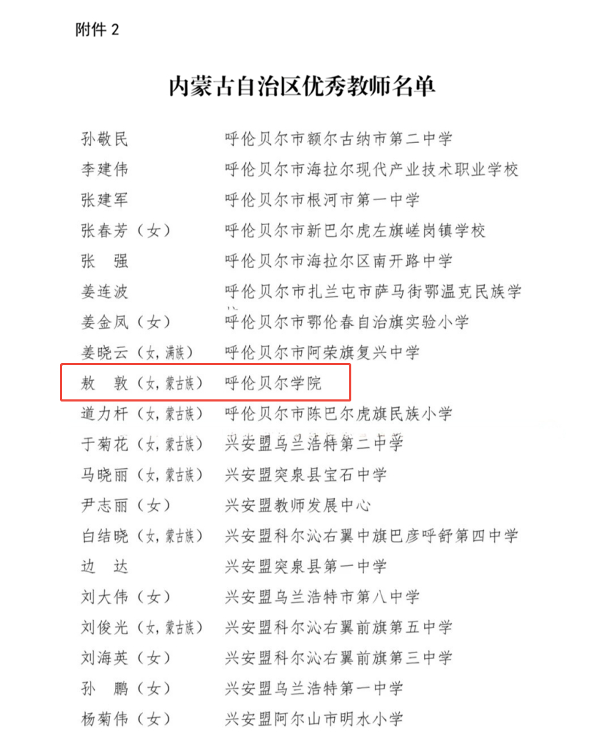在第41個教師節來臨之際,為弘揚教育家精神、營造尊師重教風尚,自治區人民政府及呼倫貝爾市委、市政府分別對全區、全市教育系統先進集體與先進個人進行表彰。我校教師與集體憑借扎實的工作成效斬獲多項榮譽:教育學院敖敦老師榮獲“內蒙古自治區優秀教師”稱號,旅游地理與歷史文化學院亞吉老師獲“呼倫貝爾市優秀教師”稱號,馬克思主義學院劉琳老師獲“呼倫貝爾市優秀德育工作者”稱號,馬克思主義學院明蘭老師獲“呼倫貝爾市優秀思想政治課教師”稱號;數理學院獲評“呼倫貝爾市教育系統先進集體”,充分彰顯我校教育教學與育人工作的突出成果。