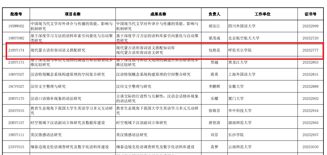 近日,我校蒙古學學院包艷花教授主持的國家社科基金項目《現代蒙古語形容詞語義搭配研究》成功通過結項評審,獲評“優秀”等級,為蒙古語語言資源建設貢獻了重要成果。