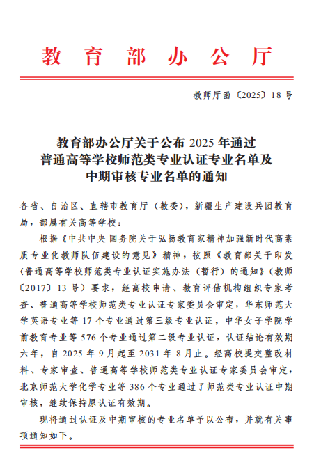 近日,教育部辦公廳正式發布了《教育部辦公廳關于公布2025年通過普通高等學校師范類專業認證專業名單及中期審核專業名單的通知》(教師廳函[2025]18號)。在此次認證中,我校美術學、思想政治教育、英語、體育教育專業成功通過第二級專業認證。數學與應用數學專業通過師范類專業認證第二級認證中期審核。