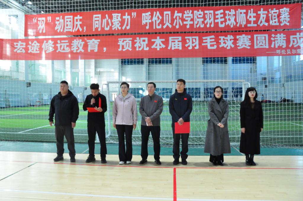 為迎接新一輪本科教育教學評估,全面提升學生綜合素質,促進德智體美勞全面發展,10月11日,由校團委主辦、體育學院(冰雪運動學院)承辦的“羽動國慶,同心聚力”羽毛球師生友誼賽在東山足球館舉行。校團委書記王曉芳,體育學院(冰雪運動學院)黨委書記胡日查畢力格、副書記凌占一,學院公共體育部主任關祥偉,團學辦主任卜祥云、副主任張娜娜,贊助商呼倫貝爾宏途修遠教育校長王洋參加開幕式。