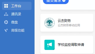為更好地服務師生,簡化校園監控調取審批流程,自2023年11月7日起,校園安全管理處開始運行網上調閱校園監控程序,我校教職工(學生可委托輔導員老師)通過電腦端和手機端企業微信進入工作臺,點擊學校監控調取申請,按照要求填寫提交。如圖: