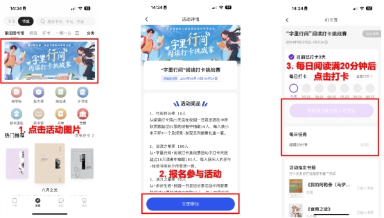 每天閱讀滿20分鐘并點擊【打卡】,打卡超過18天有獲獎資格(打卡可間斷),使用AI朗讀、自動翻頁不計入活動時長。