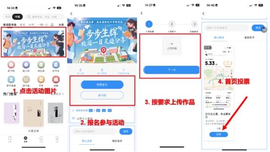 進入書城首頁,依次點擊活動圖片——我要報名——上傳相應信息即可完成提交,在評選活動首頁可直接對其他作品進行投票。